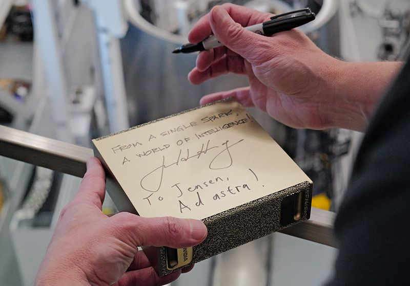 На экземпляре DGX Spark для Маска Хуанг оставил надпись: «Из одной искры — мир интеллекта». Маск добавил ответное послание на латыни: «К Дженсену, к звёздам», что подчеркивает их взаимное уважение.